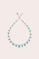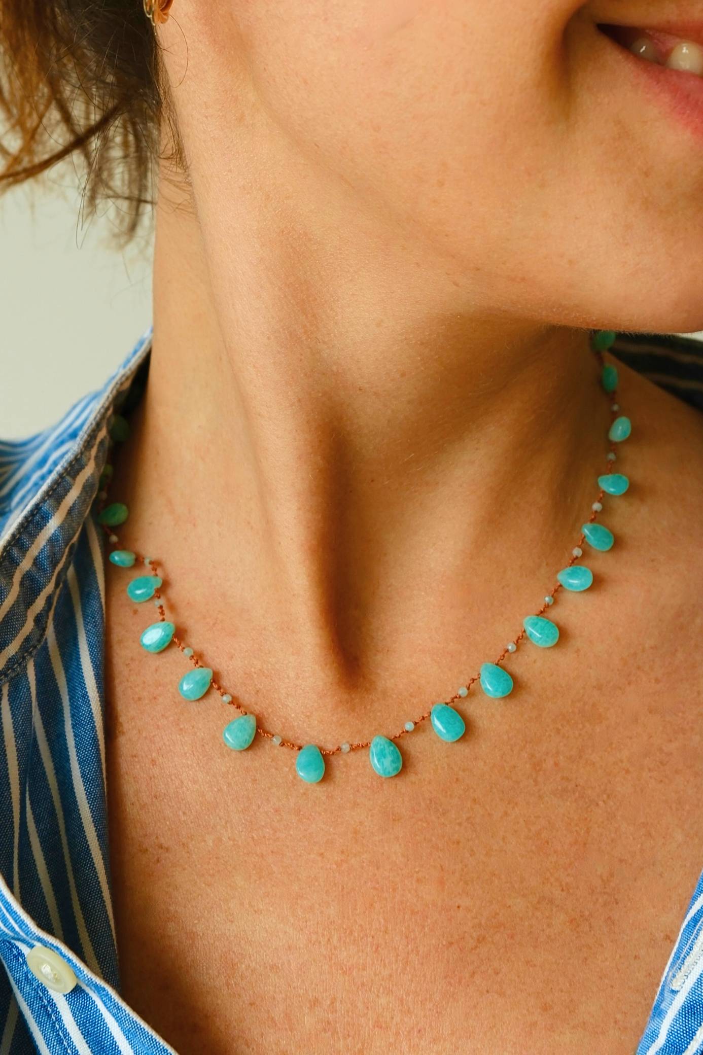 Le collier Beetle se distingue par ses perles d'amazonite, d’un bleu apaisant et lumineux. L’amazonite, surnommée la « pierre du courage », est réputée pour ses vertus calmantes, équilibrant les émotions tout en encourageant la communication sincère. Chaque perle, minutieusement polie, révèle des variations subtiles de bleu turquoise qui capturent et reflètent délicatement la lumière.