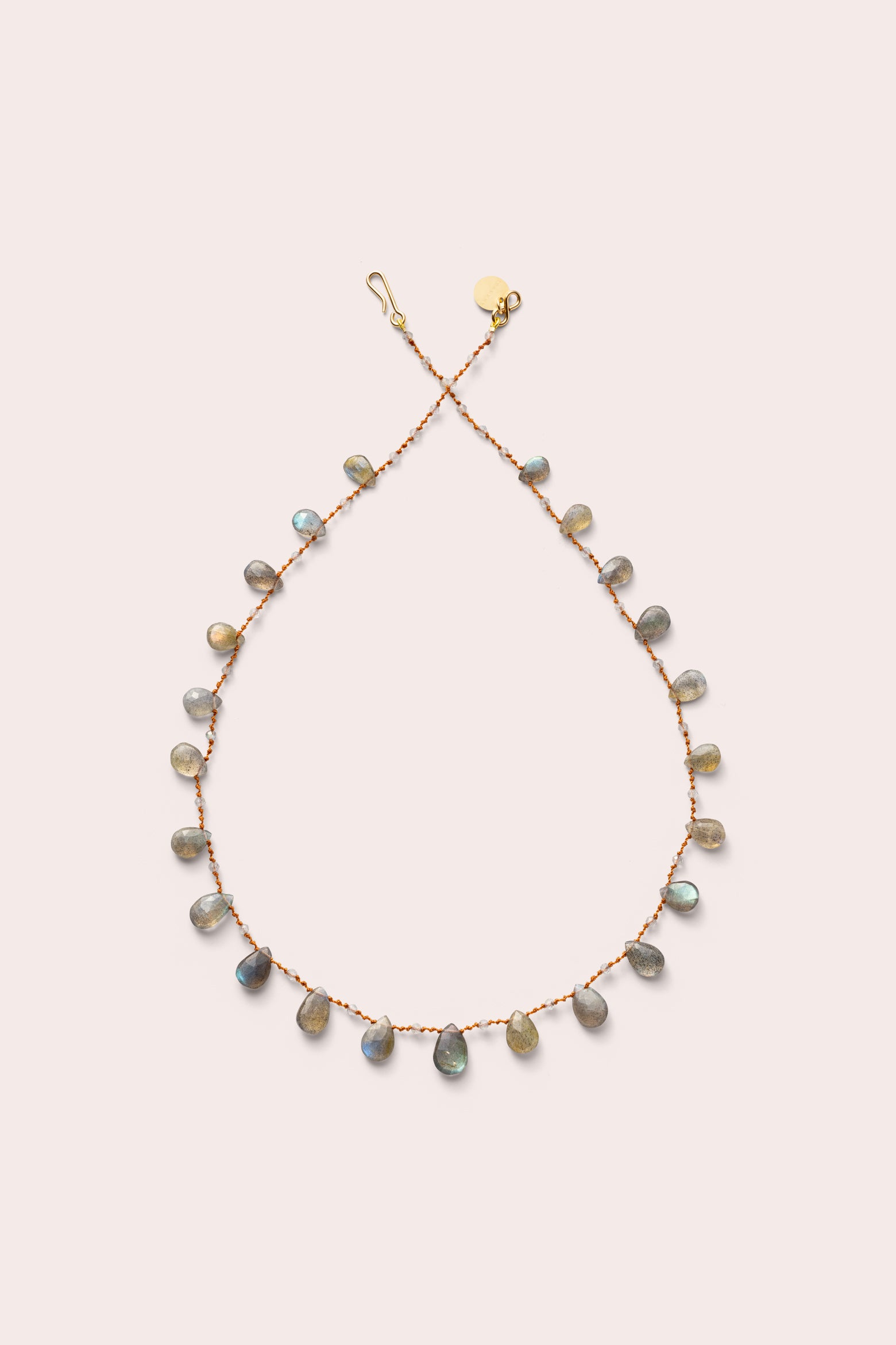 Le collier 'Odin' en labradorite capte la magie de la lumière avec ses reflets irisés. Chaque perle, taillée avec soin, dévoile des nuances changeantes de bleu, de vert et de gris, comme une aurore boréale figée dans la pierre. La labradorite, connue pour ses propriétés protectrices et apaisantes, éveille la créativité et renforce l’intuition.