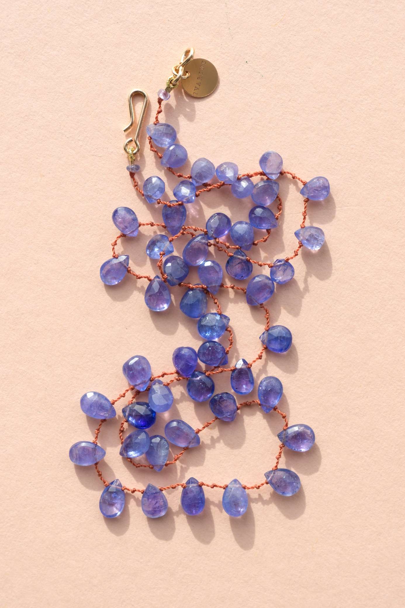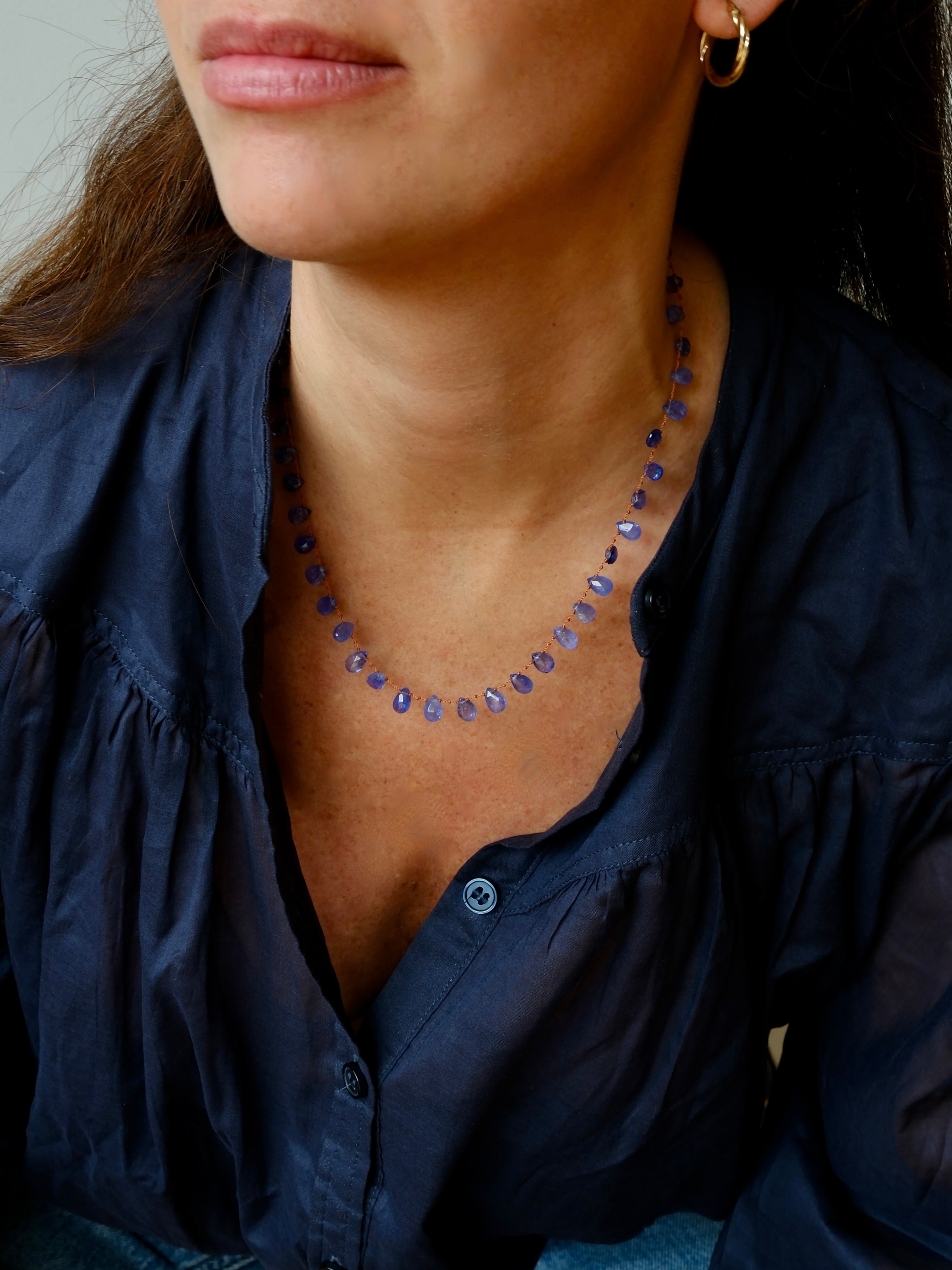 Le collier Tanzanite Mini avec ses briolettes facettées évoque une élégance délicate, teintée de mystère. Les fines gouttes, oscillant entre des reflets bleus profonds et des nuances de violet tendre, captent la lumière avec une discrétion précieuse.