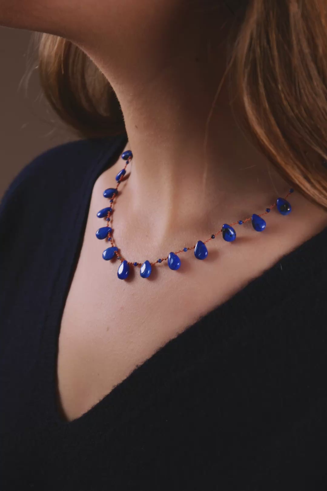 Ce collier en lapis-lazuli met en valeur la profondeur bleue et les éclats dorés uniques de cette pierre millénaire, formée par la fusion naturelle du lazurite et de la pyrite. Réputée pour apporter clarté mentale et sérénité, le lapis-lazuli inspire sagesse et connexion spirituelle.