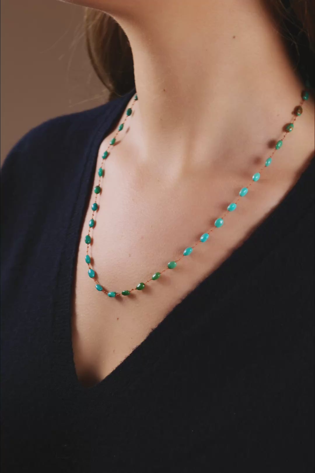 Des pierres naturelles taillées en perles ovales ultra polies, montées sur un cordon fin et presque invisible.