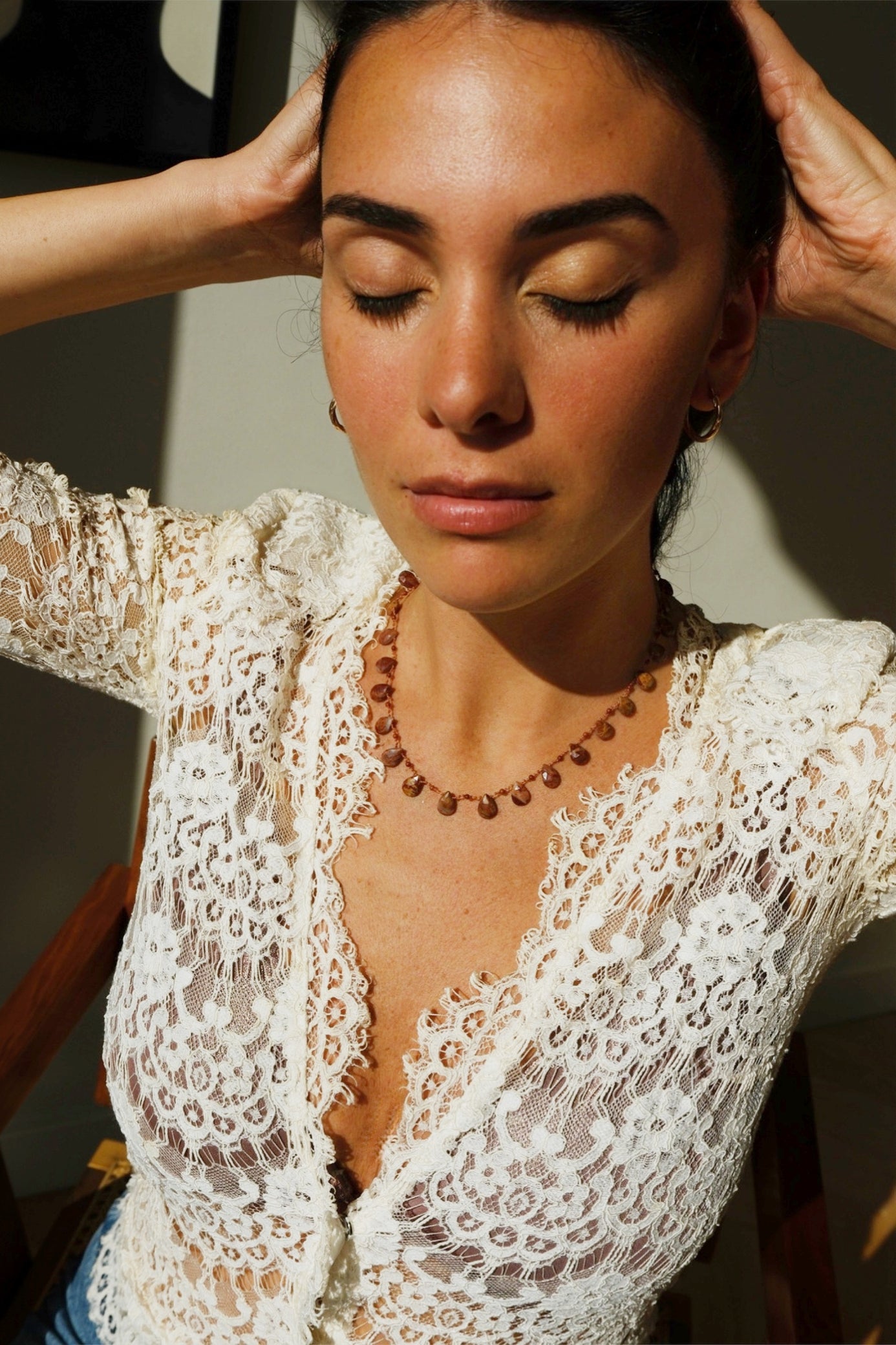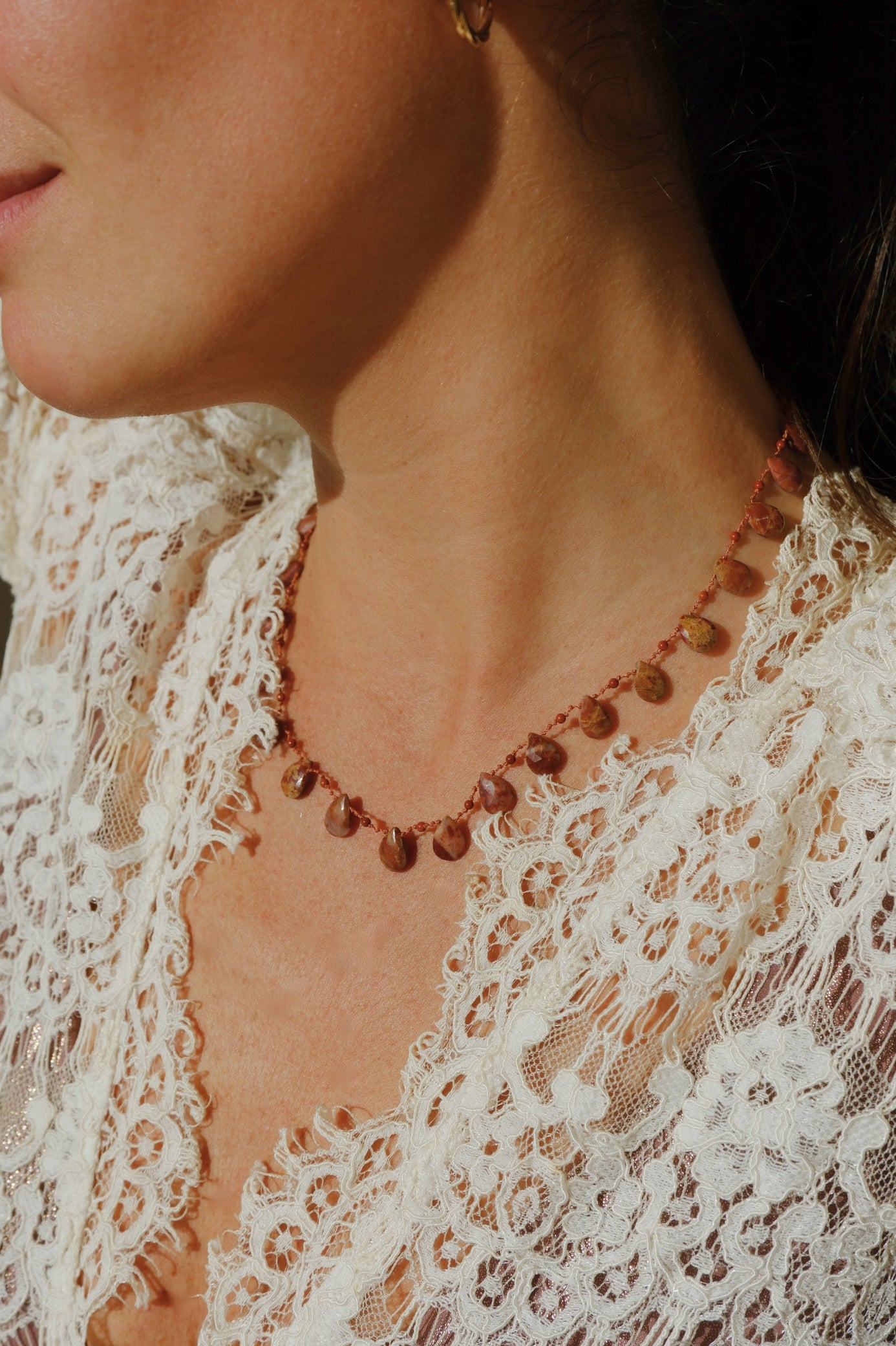 Le collier Harper révèle une symphonie de textures et de couleurs terreuses, évoquant des paysages naturels sculptés par le temps. Les tons chauds et organiques de ces pierres rappellent la stabilité de la terre et la force tranquille de la nature.
