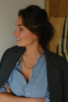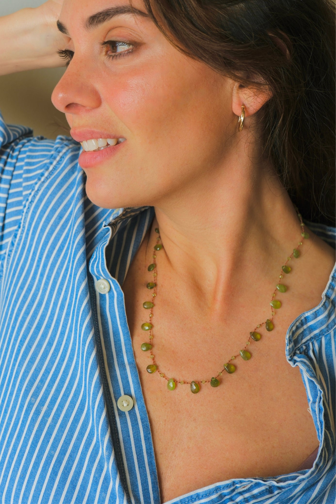 Le collier Linwood en vésuvianite facettée incarne une élégance vibrante et un charme naturel. Les fines gouttes de vésuvianite, avec leurs nuances de vert et de kaki, offrent une harmonie subtile qui se marie aisément à toutes les palettes de couleurs.