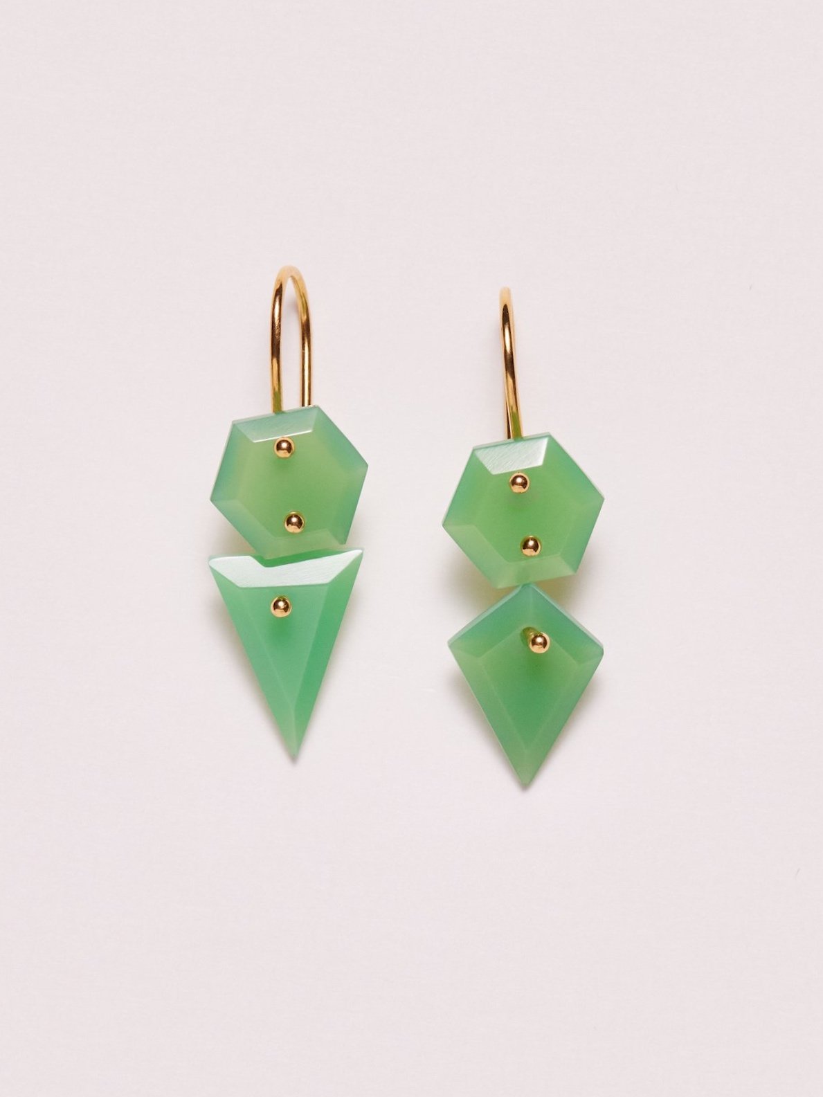 Les boucles d’oreilles Ewing mêlent harmonieusement géométrie et éclat naturel. Composées de chrysoprase éclatante ou d’onyx vert profond, elles se distinguent par leur silhouette articulée et leurs nuances vibrantes, sublimées par des détails dorés.