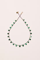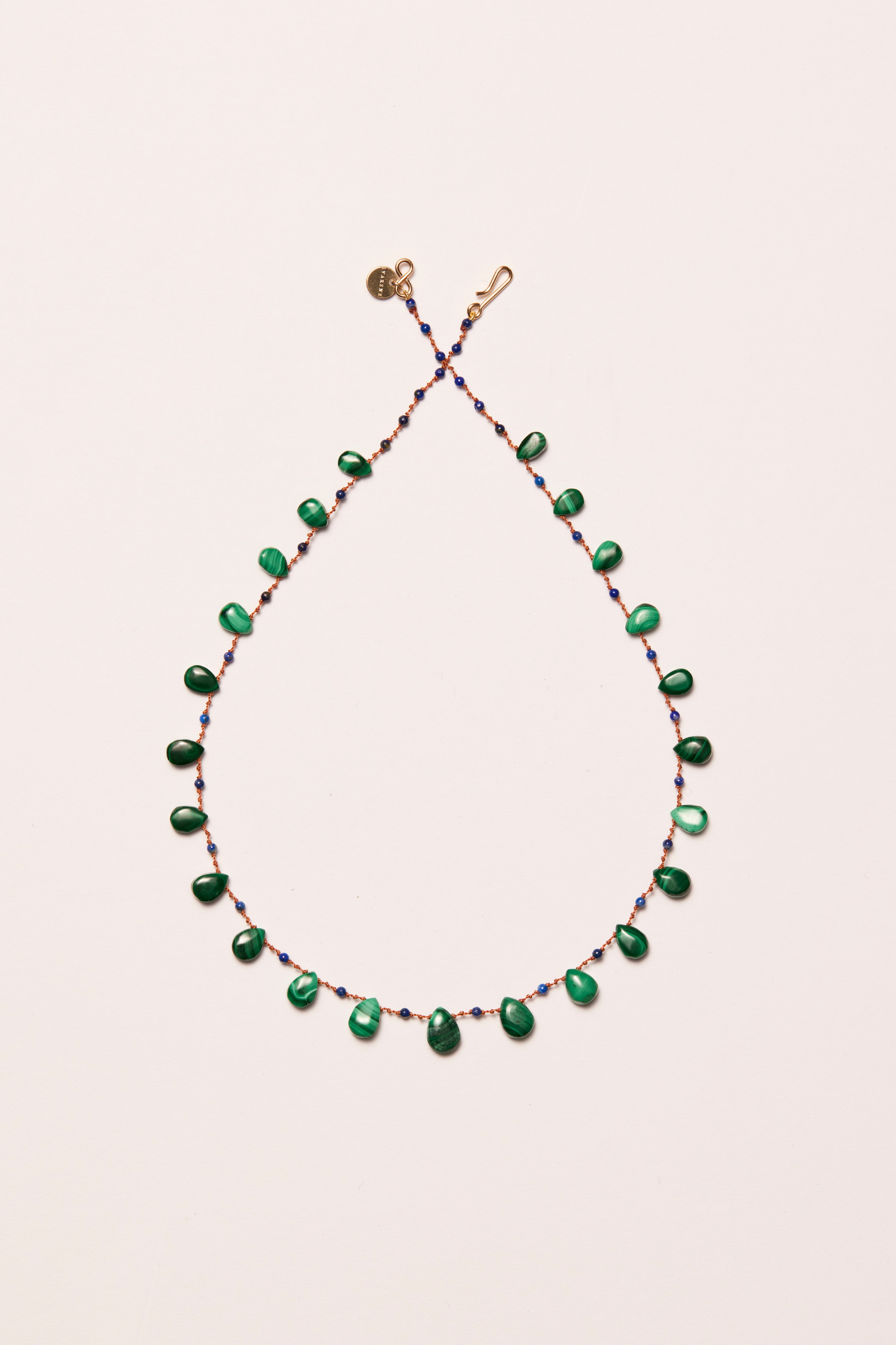 Le collier Bonview mêle harmonieusement la malachite et le lapis-lazuli, deux pierres réputées pour leur beauté vibrante et leurs propriétés bénéfiques. Les briolettes de malachite, sont espacées de manière équilibrée avec des perles de lapis-lazuli.