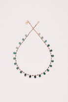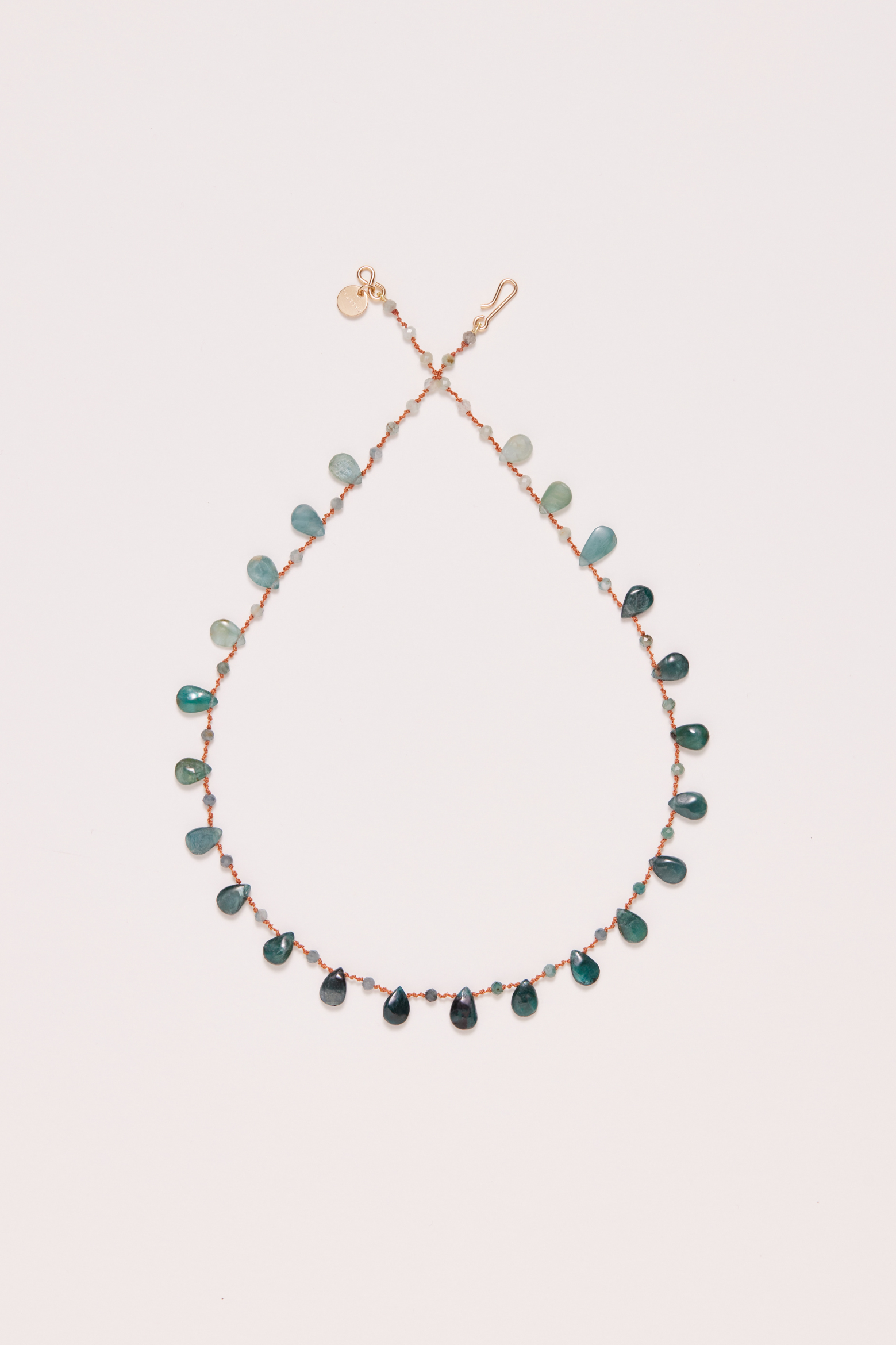 Le collier Osprey en grandidiérite se distingue par ses nuances profondes et captivantes de bleu-vert, typiques de cette pierre précieuse rare. Les pierres en forme de gouttes sont soigneusement taillées et disposées tout le long du collier, créant un rythme visuel fluide et harmonieux. Elles varient subtilement en teinte, passant de tons clairs et translucides à des bleus plus sombres et profonds.