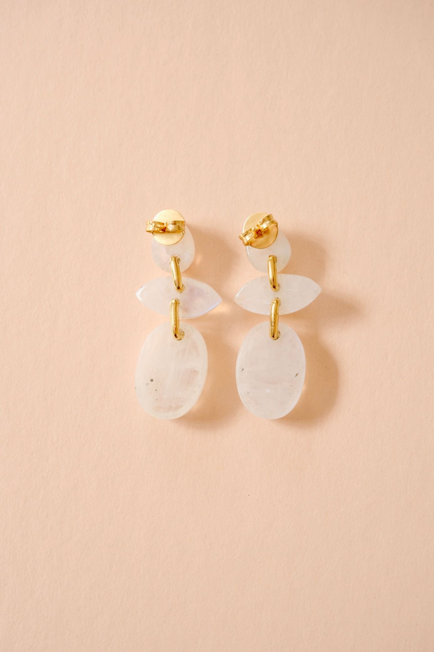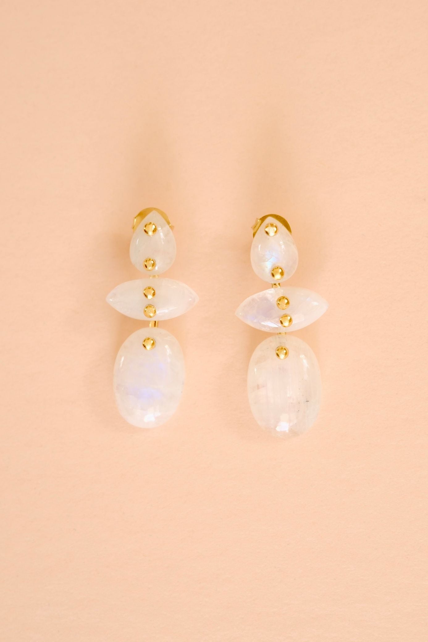 The three stones, carefully selected for their beauty, are mounted on a vermeil base, combining solid silver with a fine layer of 18-carat gold for a long-lasting, refined sparkle. The sleek, elegant design enhances the natural beauty of the stones while ensuring comfortable, secure wear thanks to its chip clasps.