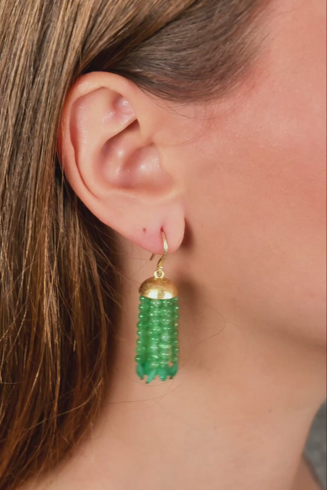 De fines grappes de chrysoprase, montées à la main sur fil de soie, se balancent sous un dôme doré en laiton plaqué or 18 carats (5 microns).
