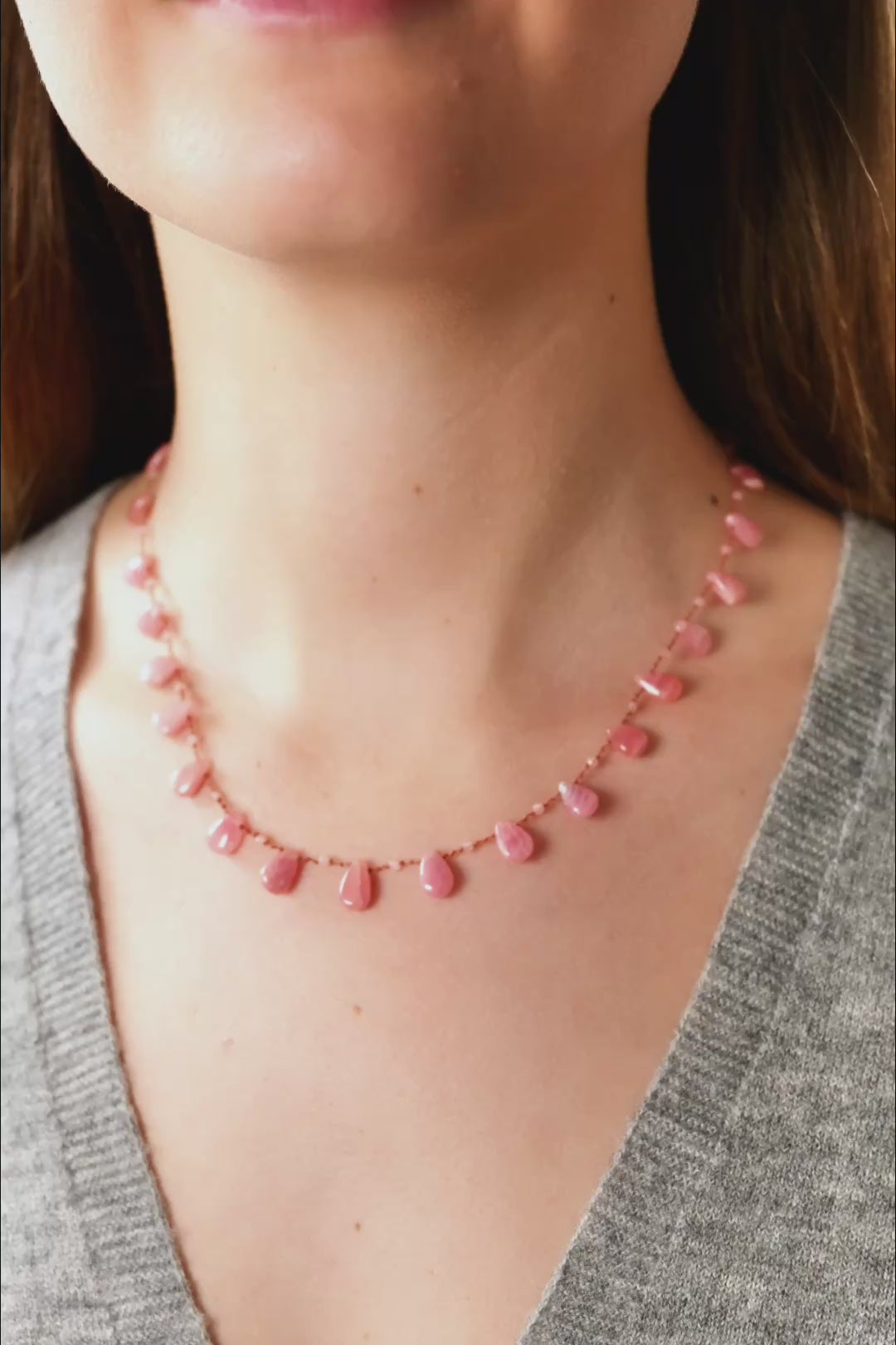 The Cheremoya necklace in rhodochrosite radiates a gentle warmth and a nurturing energy. Its rhodochrosite drops, with vibrant pink hues interwoven with delicate white or gray veins, shine like beams of light, softly illuminating the skin. Known for its soothing and comforting properties, rhodochrosite invites self-love and emotional healing.