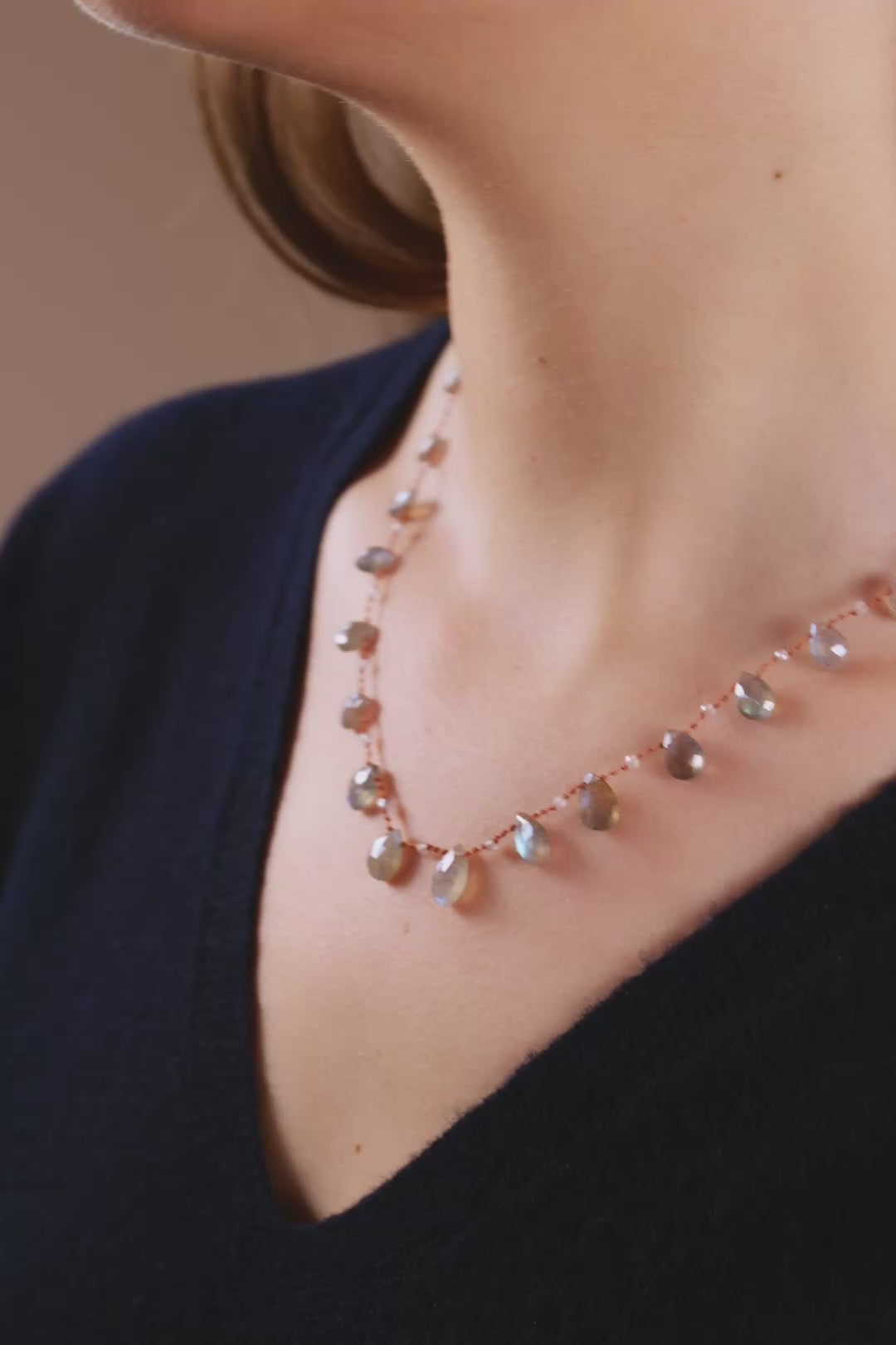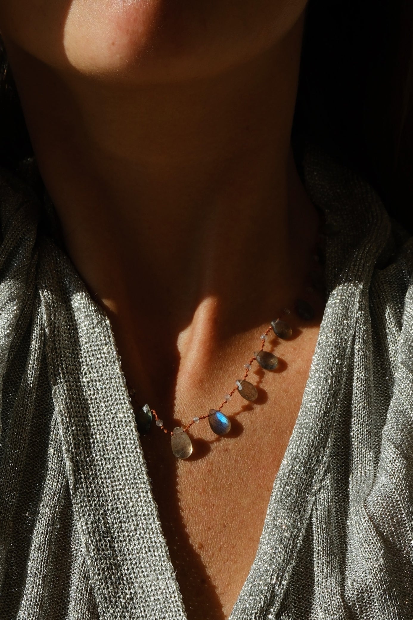 The 'Odin' labradorite necklace captures the magic of light with its iridescent reflections. Each carefully cut pearl reveals changing shades of blue, green and gray, like an aurora borealis frozen in stone. Labradorite, known for its protective and soothing properties, awakens creativity and strengthens intuition.