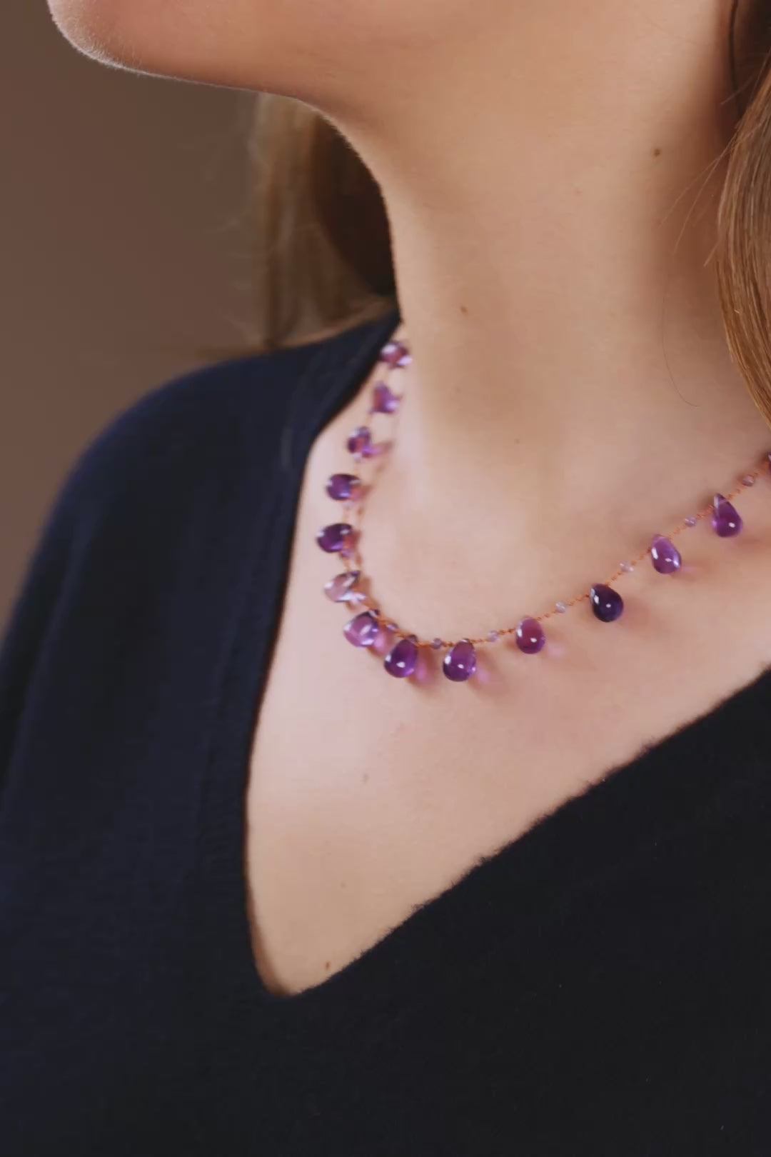 The Niilo necklace celebrates the rich and soothing depth of amethyst. Its stones, in shades of intense purple, bring a feeling of balance and calm. Delicately spaced, they create a fluid and harmonious rhythm, inviting serenity. Known for its protective virtues, amethyst makes this jewel a companion carrying wisdom and gentleness.