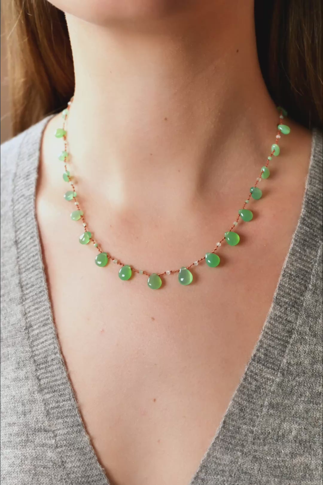 This necklace enchants with its finely crafted chrysoprases, whose vibrant green hues instantly evoke freshness and renewal. Each stone, polished into a smooth drop, glides gently to the touch, evoking the fluidity and lightness of nature.