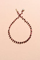 Ses briolettes taillées en gouttes lisses se déclinent dans des nuances prune veloutées, oscillant entre rouge profond et reflets violacés.