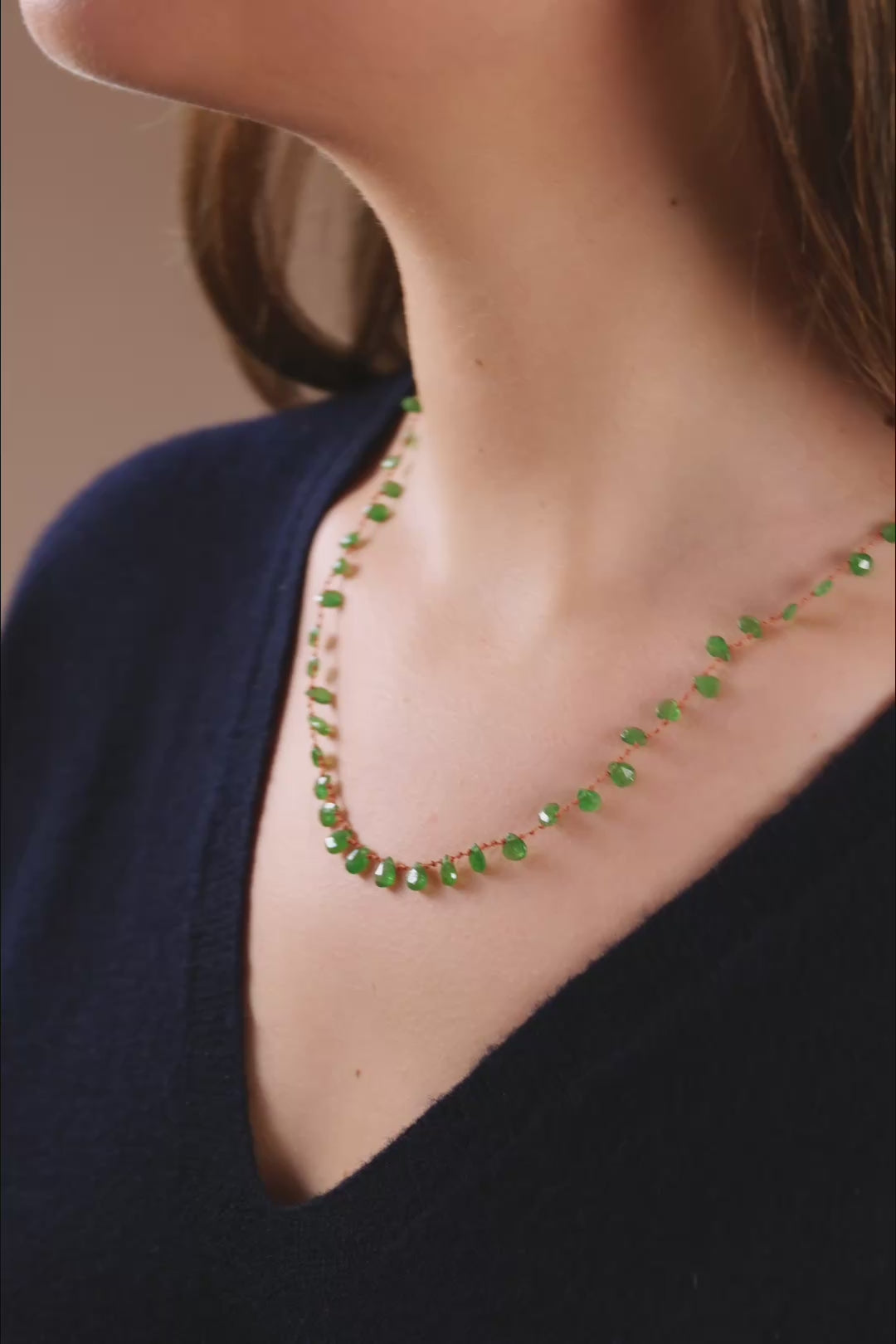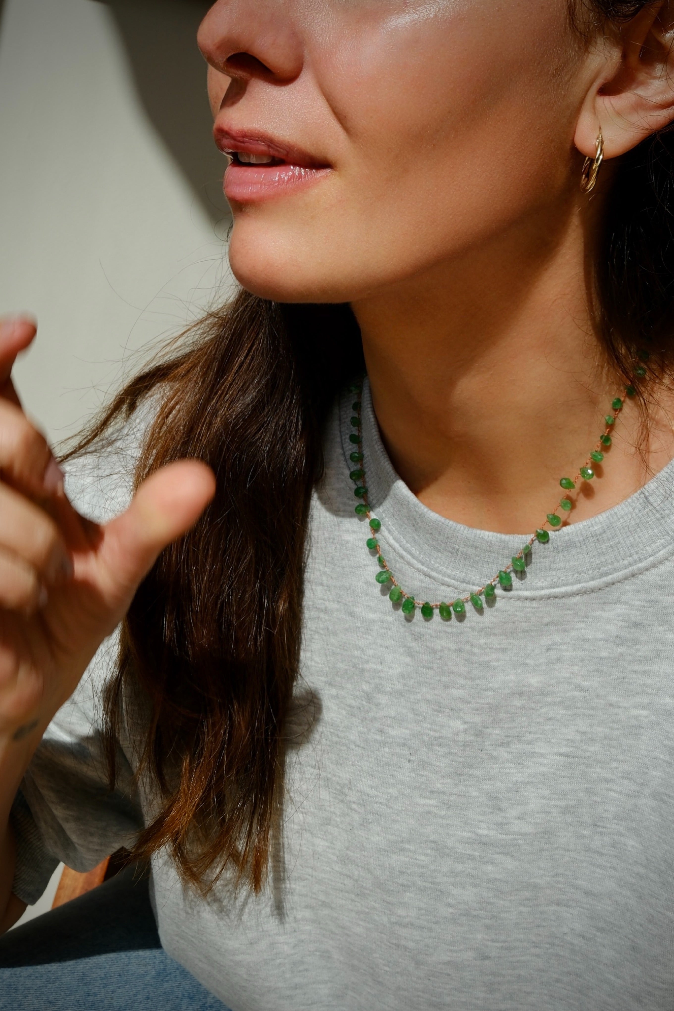 Le collier Tsavorite Mini est une invitation à la vitalité et à l’énergie. Les gouttes de tsavorite, éclatantes dans leurs tons verts intenses, rappellent la force d’une nature luxuriante, vibrante de vie.