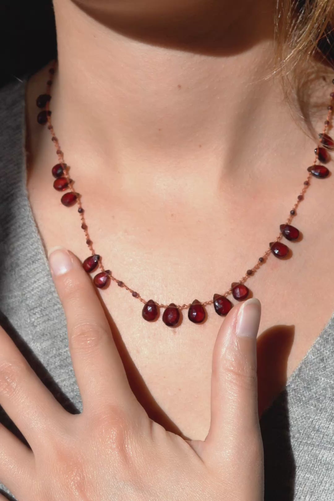 Dans cette version, les briolettes de grenat diffusent une lumière profonde, entre rouge et brun, pour une allure chaude et intemporelle.