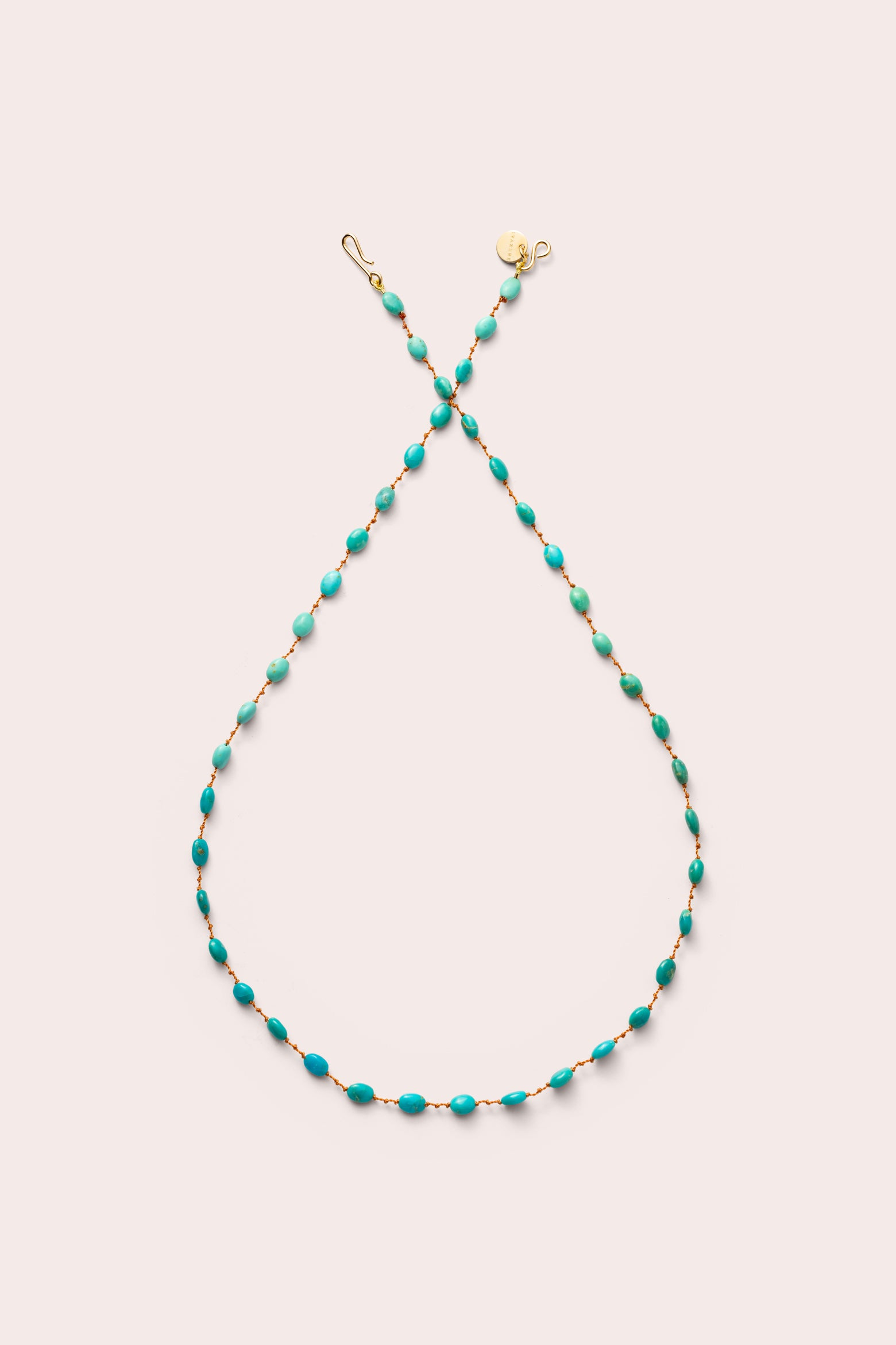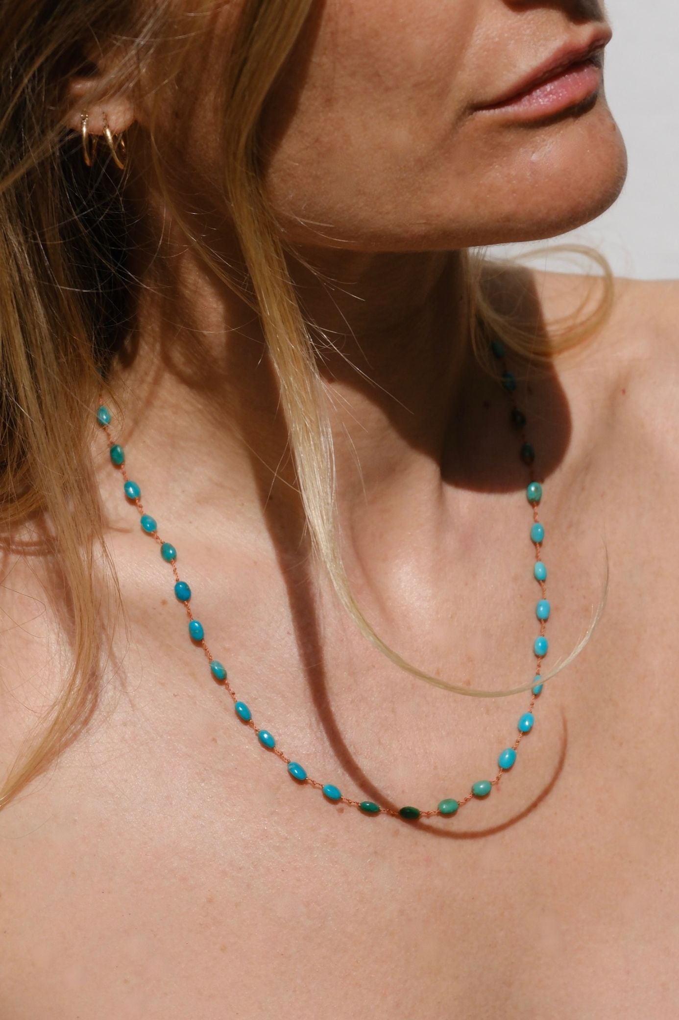 The Turquoise necklace embodies balance and protection, a touch of serenity that crosses the seasons with discreet elegance and soft light. A reassuring radiance that stands out in winter light as well as on sunny days.