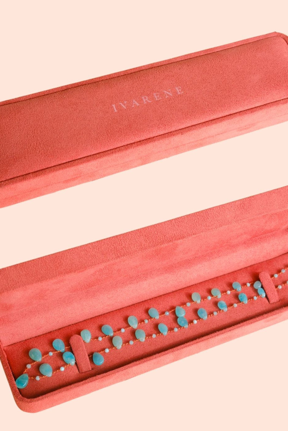 Les pierres, subtilement espacées par trois nœuds délicats, se succèdent harmonieusement sur un cordon soyeux, montage emblématique de la maison IVARENE. Le fermoir en Or 14k gold filled apporte une touche finale d’élégance, scellant ce bijou avec finesse et sécurité.