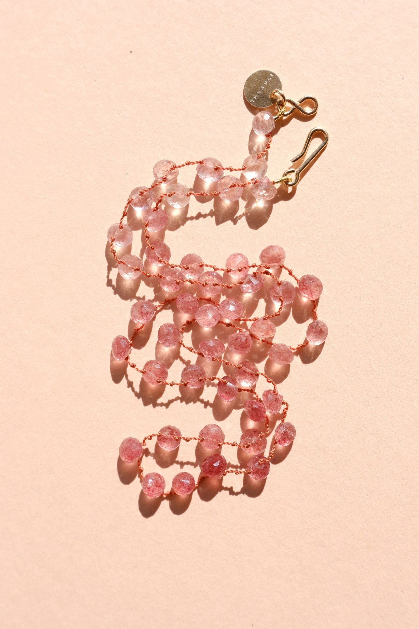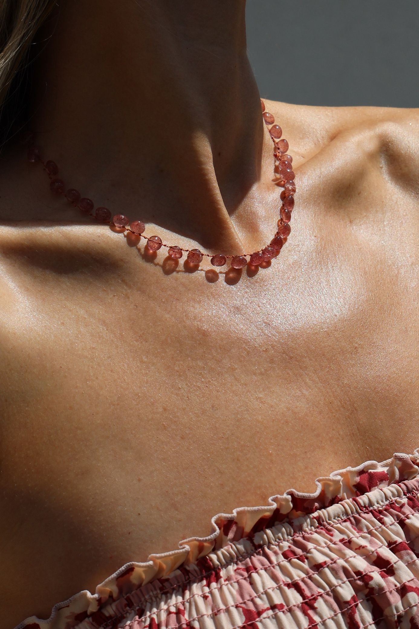 Le collier en strawberry quartz, avec ses pierres taillées en forme de petits grelots lisses incarne une douceur lumineuse et une élégance délicate. Ses délicates nuances de rose tendre et de framboise, diffusent une aura chaleureuse et subtile.