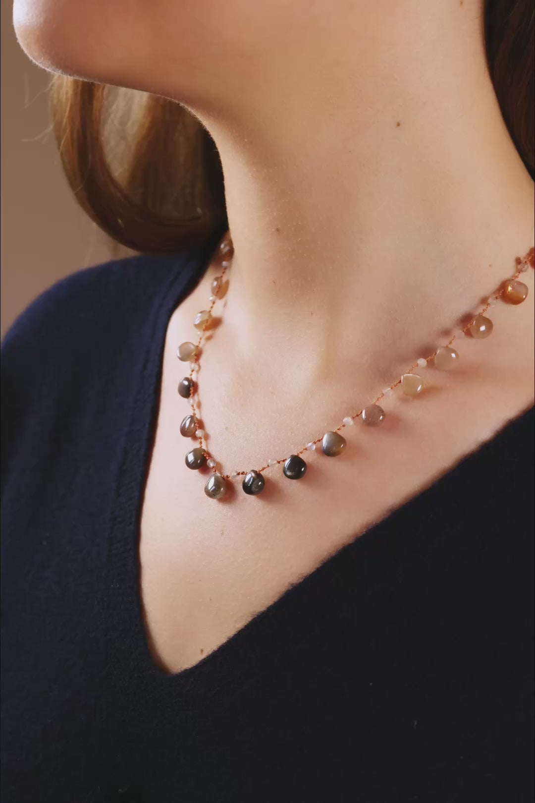 The Beachwood golden moonstone necklace reveals subtle shades of gold, from light beige to warmer shades of caramel. Each soft, luminous stone reveals golden, pearly sparkles.