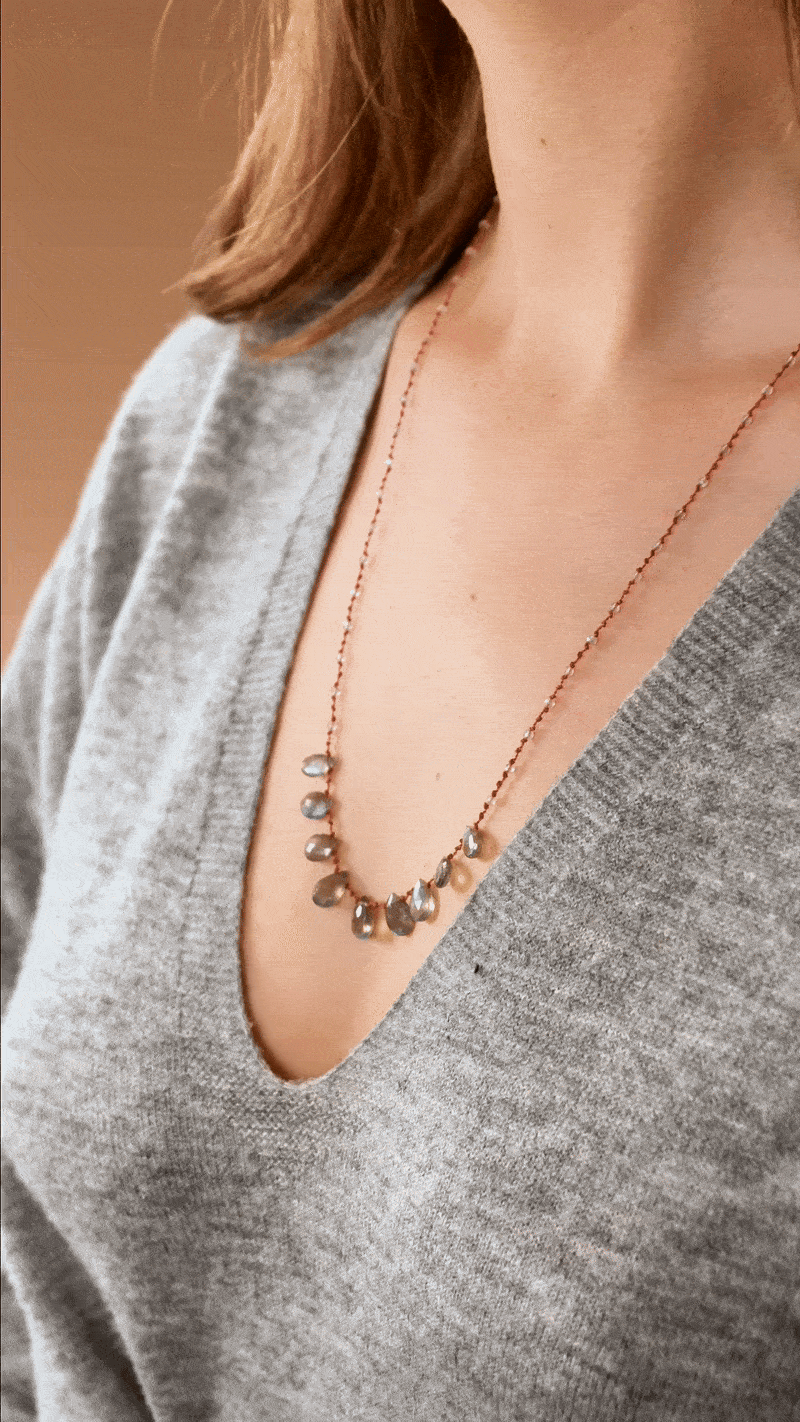 Le collier 9 Gouttes déploie neuf briolettes précieuses de labradorite, qui captent la lumière à chaque mouvement.