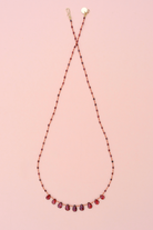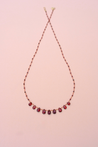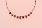 Le collier 9 Gouttes déploie neuf briolettes précieuses de grenat, aux reflets profonds et intenses.