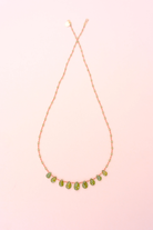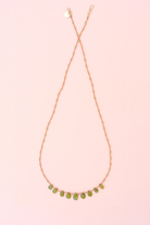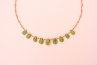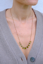 Le collier 9 Gouttes déploie neuf briolettes précieuses de vésuvianite, aux nuances subtiles de vert kaki et de doré, qui captent la lumière avec douceur.