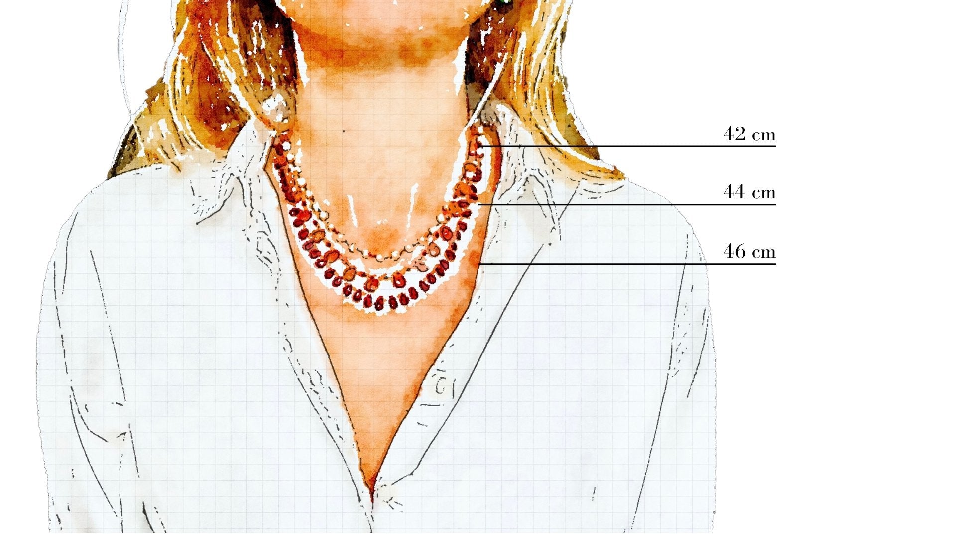 La taille standard de nos colliers est 44 cm, il existe parfois des colliers en tailles plus courtes ou plus longues. La taille est précisée dans le descritptif de chaque collier. Et vous pouvez vous référer à cette illustration pour visualiser les tailles. Cependant, nous sommes tous/ toutes différent(es), nous vous recommandons de vous munir d’un mètre ruban pour avoir un rendu fiable de la longueur d’un collier ou bracelet.